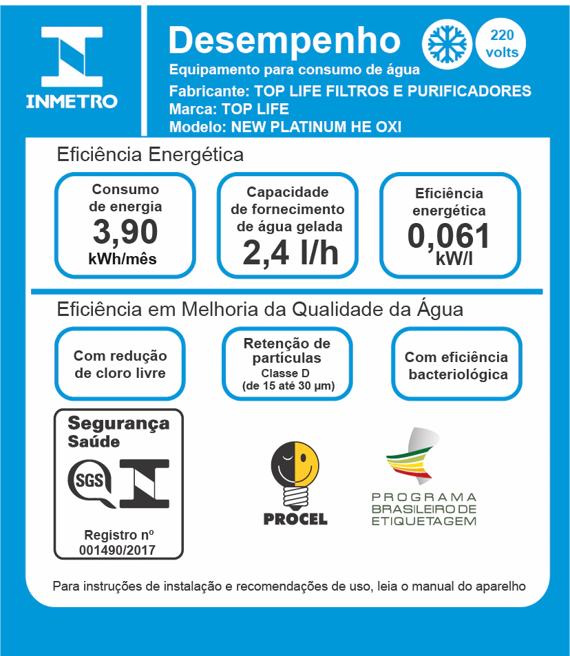 - Todos os modelos de purificadores de água da TOP LIFE são aprovados pelo INMETRO (Instituto Nacional de Metrologia, Qualidade e Tecnologia), sendo assim, tem eficiência e qualidade atesta e comprovada.